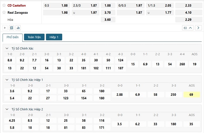 Bảng tỷ lệ kèo bóng đá trận đấu Castellon vs Real Zaragoza