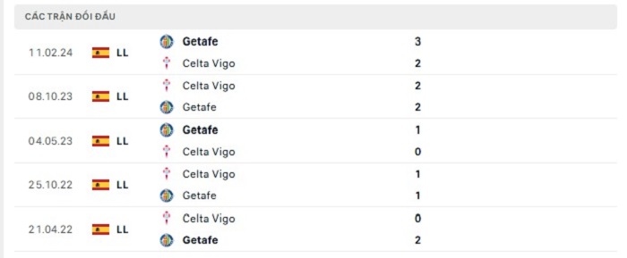 Bảng bóng đá trận đấu Celta Vigo vs Getafe