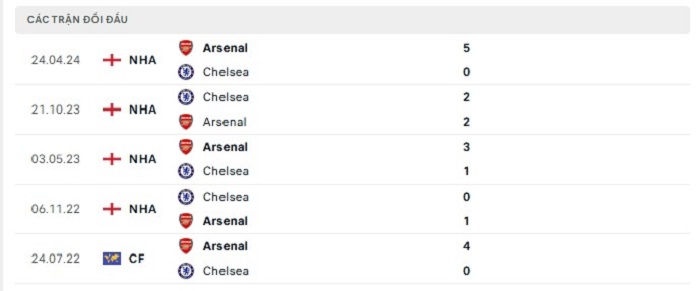 Phong độ gần đây Chelsea vs Arsenal