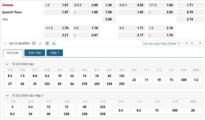 Bảng tỷ lệ kèo bóng đá trận đấu Chelsea vs Ipswich