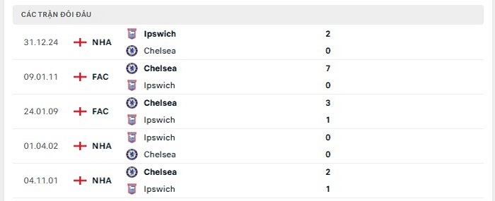 Thành tích trong quá khứ cũng gần như hoàn toàn đứng về phía Chelsea, cụ thể tổng cộng 7 lần gặp nhau trước đây của hai đội thì đội bóng thành phố London thắng kèo châu Âu 4 trong khi chỉ hoà 2 và thua 1 trước Ipswich. Trên sân nhà của mình tại mùa giải năm nay với Chelsea họ cũng có được những thành công đáng kể khi đã thu về được 9 trận thắng kèo châu Âu tại tổ ấm của mình, do vậy mà với những lợi thế đang có được hiện tại việc Chelsea có thêm một chiến thắng cũng là trong tầm tay của họ.