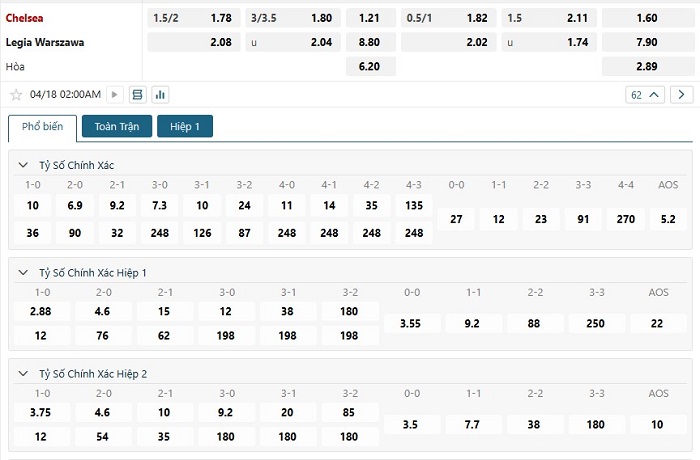Bảng tỷ lệ kèo bóng đá trận đấu Chelsea vs Legia Warszawa