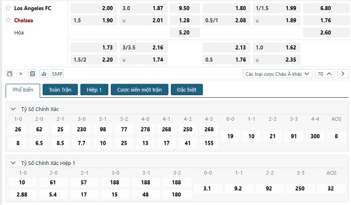 Bảng tỷ lệ kèo bóng đá trận đấu Chelsea vs Los Angeles FC