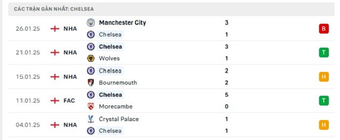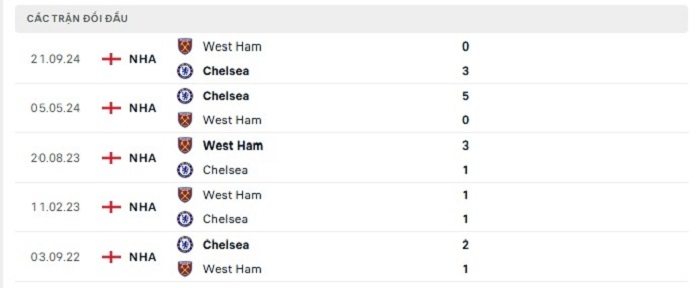 Phong độ gần đây Chelsea vs West Ham