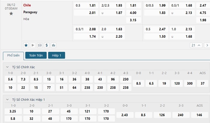 Bảng tỷ lệ kèo bóng đá trận đấu Chile vs Paraguay