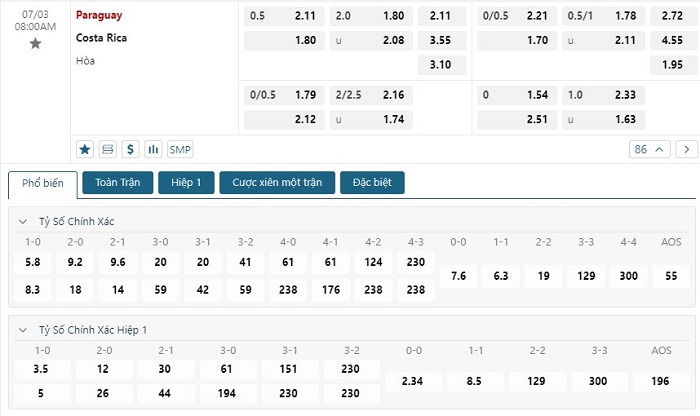 Bảng tỷ lệ kèo bóng đá trận đấu Costa Rica vs Paraguay