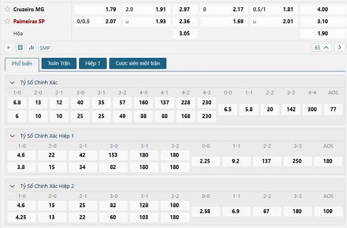 Bảng tỷ lệ kèo bóng đá trận đấu Cruzeiro vs Palmeiras