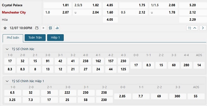 Soi kèo tỷ số Crystal Palace vs Manchester City