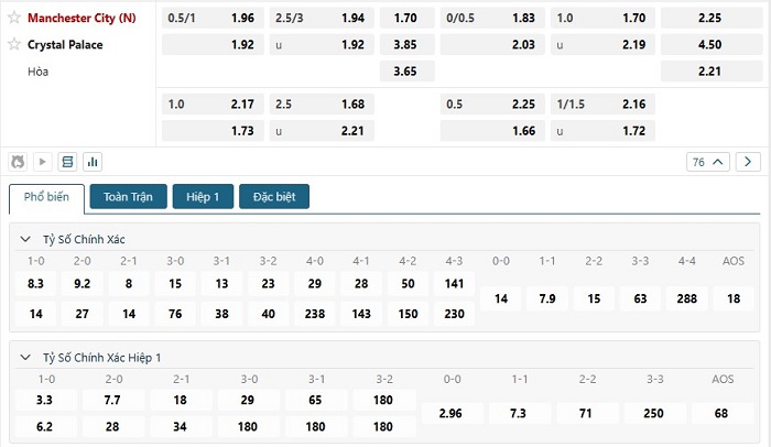 Bảng tỷ lệ kèo bóng đá trận đấu Crystal Palace vs Manchester City