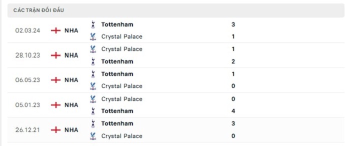 Lịch sử đối đầu của Crystal Palace vs Tottenham