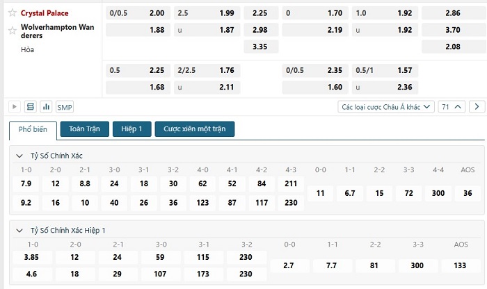 Bảng tỷ lệ kèo bóng đá trận đấu Crystal Palace vs Wolves