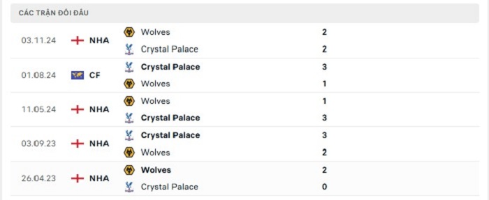 Lịch sử đối đầu của Crystal Palace vs Wolves