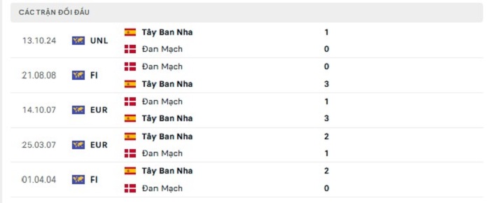 Lịch sử đối đầu của Đan Mạch vs Tây Ban Nha