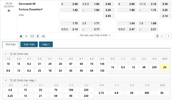 Bảng tỷ lệ kèo bóng đá trận đấu Darmstadt vs Fortuna Dusseldorf