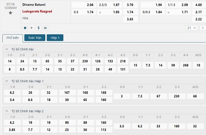 Bảng tỷ lệ kèo bóng đá trận đấu Dinamo Batumi vs Ludogorets Razgrad