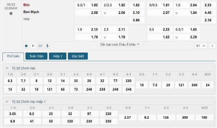 Bảng tỷ lệ kèo bóng đá trận đấu Đức vs Đan Mạch
