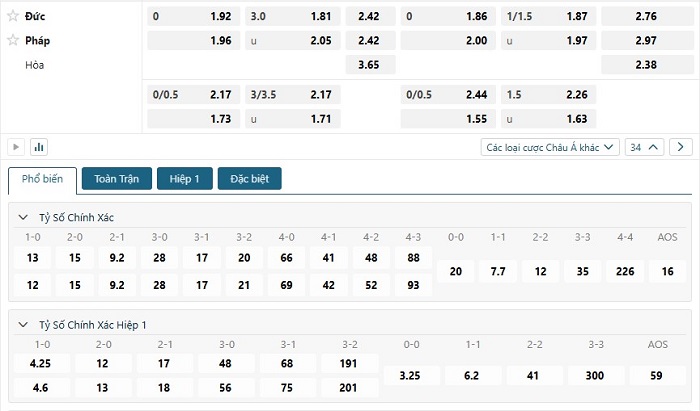 Bảng tỷ lệ kèo bóng đá trận đấu Đức vs Pháp
