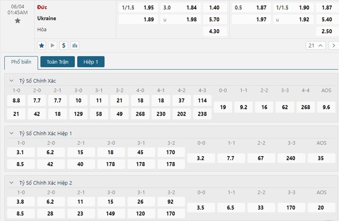 Bảng tỷ lệ kèo bóng đá trận đấu Đức vs Ukraine