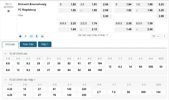 Bảng tỷ lệ kèo bóng đá trận đấu Eintracht Braunschweig vs FC Magdeburg