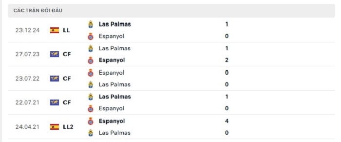 Giữa Espanyol và Las Palmas trong quá khứ vốn cũng không có sự chênh lệch đáng kể với nhau, thật vậy bởi khi mà mỗi bên có cho mình được 3 trận đấu thắng kèo châu Âu trong khi hoà 4 tại những lần gặp nhau trước. Tuy nhiên trên sân nhà của mình Espanyol có được những thành công đáng kể trước đối thủ khi chỉ thua 1 theo kèo châu Âu trong những lần tiếp đón đối thủ này, bởi vậy mà với lợi thế sân nhà hiện tại việc Espanyol có một thắng lợi theo kèo châu Âu cũng là điều có thể hiểu được.