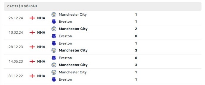 Phong độ gần đây Everton vs Manchester City