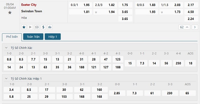 Bảng tỷ lệ kèo bóng đá trận đấu Exeter vs Swindon