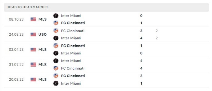 Xét về mặt thành tích trong quá khứ của cả hai đội cũng không quá chênh lệch khi FC Cincinnati thắng 3 thì cũng để thua 4 trước Inter Miami theo mức kèo châu Âu cả trận. Hai đội cũng đã có 2 lần đã bất phân thắng bại trong những lần gặp nhau cho thấy thực lực hiện tại cũng rất ngang nhau. Chính vì vậy mà khả năng hai đội bất phân thắng bại trong lần gặp nhau sắp tới cũng sẽ là lựa chọn sáng suốt.