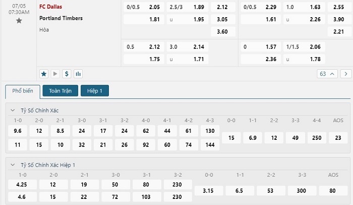 Bảng tỷ lệ kèo bóng đá trận đấu FC Dallas vs Portland Timbers