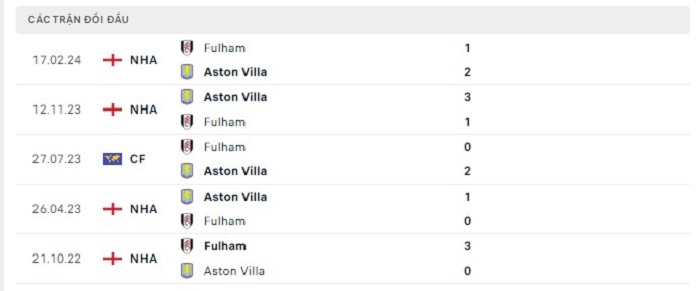 Lịch sử đối đầu của Fulham vs Aston Villa