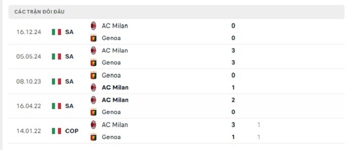 Phong độ gần đây Genoa vs AC Milan