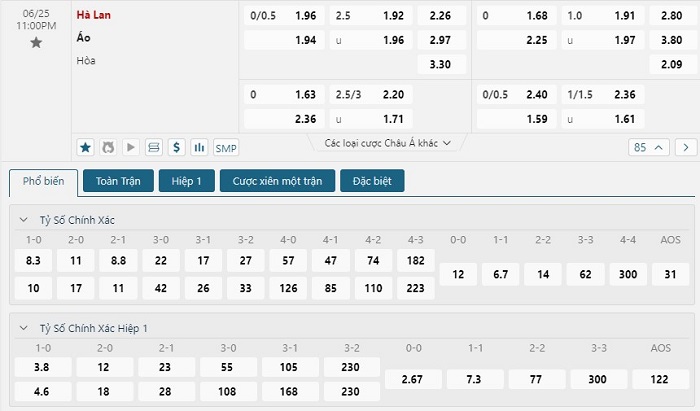 Bảng tỷ lệ kèo bóng đá trận đấu Hà Lan vs Áo