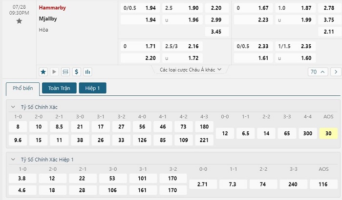 Bảng tỷ lệ kèo bóng đá trận đấu Hammarby vs Mjallby