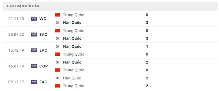 Phong độ gần đây Hàn Quốc vs Trung Quốc