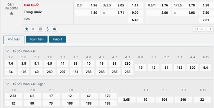 Bảng tỷ lệ kèo bóng đá trận đấu Hàn Quốc vs Trung Quốc