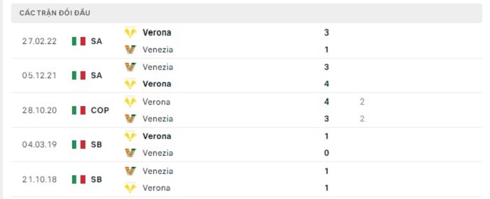 Lịch sử đối đầu của Hellas Verona vs Venezia