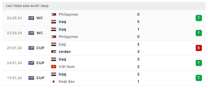 Với việc sớm có được tấm vé đi tiếp thì Iraq hứa hẹn sẽ tạo nên một lối chơi phần nào phóng thoáng hơn. Thực tế có thể nhận thấy được cả 2 lần gặp nhau gần đây của hai đội cũng đã cống hiến cho khán giả những trận cầu hấp dẫn với nhiều bàn thắng ghi được. Vì vậy mà không loại trừ khả năng trận đấu tiếp theo sắp tới đây cũng có thể xuất hiện tỷ số trận đấu ghi được nhiều với cục diện gần như đã an bài với cả hai đội hiện nay.