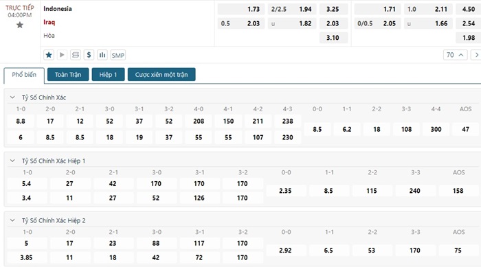 Bảng tỷ lệ kèo bóng đá trận đấu Indonesia vs Iraq