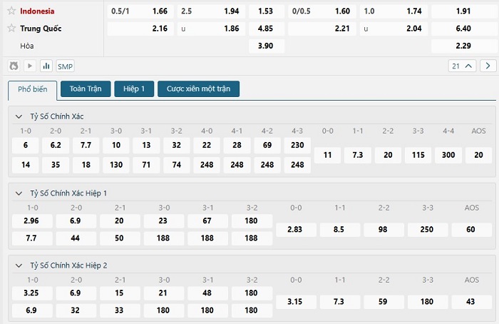 Bảng tỷ lệ kèo bóng đá trận đấu Indonesia vs Trung Quốc