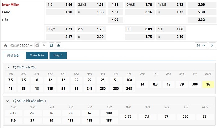 Vẫn biết là Inter Milan có được những thành công nhiều trước Lazio trong nhiều năm qua, bằng chứng cụ thể là đội bóng thành phố Milan thắng 6, hoà 2 và thua 2 theo mốc kèo châu Âu ở những lần gặp nhau trước. Với Lazio thì hy vọng để họ có thể tìm kiếm danh hiệu cho mình là sân chơi Cúp quốc gia mùa này do vậy mà sự quyết tâm của đội khách cũng hoàn toàn có thể hiểu được, bởi vậy mà không loại trừ khả năng bất phân thắng bại của hai đội theo kèo châu Âu ở lần gặp nhau sắp tới.
