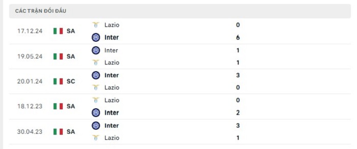 Bảng bóng đá trận đấu Inter Milan vs Lazio