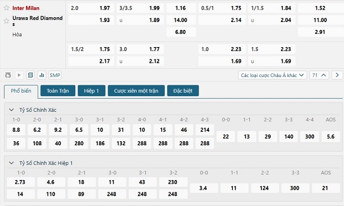Bảng tỷ lệ kèo bóng đá trận đấu Inter Milan vs Urawa Red Diamonds