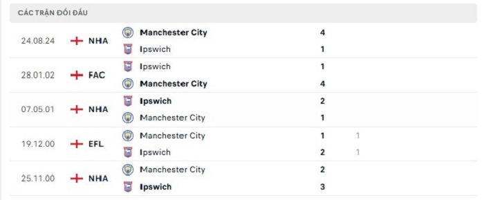 Lịch sử đối đầu của Ipswich vs Manchester City