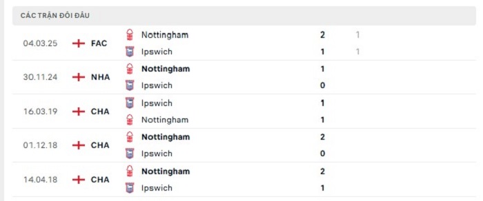 Lịch sử đối đầu của Ipswich vs Nottingham