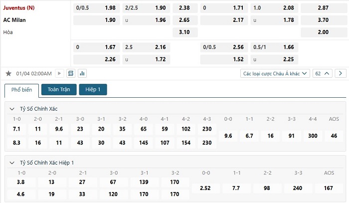 Soi kèo châu Á, kèo chấp Juventus vs AC Milan