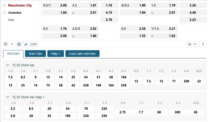 Bảng tỷ lệ kèo bóng đá trận đấu Juventus vs Manchester City