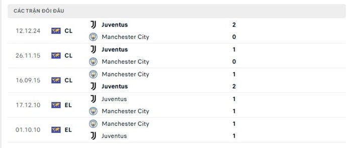 Lịch sử đối đầu của Juventus vs Manchester City