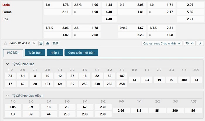 Bảng tỷ lệ kèo bóng đá trận đấu Lazio vs Parma