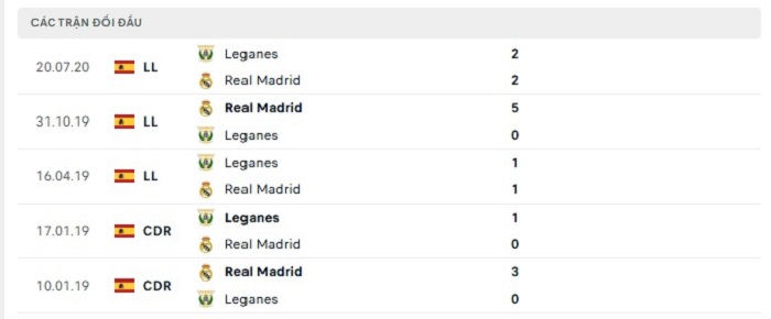Bảng bóng đá trận đấu Leganes vs Real Madrid