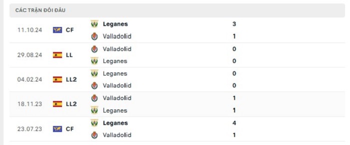 Lịch sử đối đầu của Leganes vs Real Valladolid