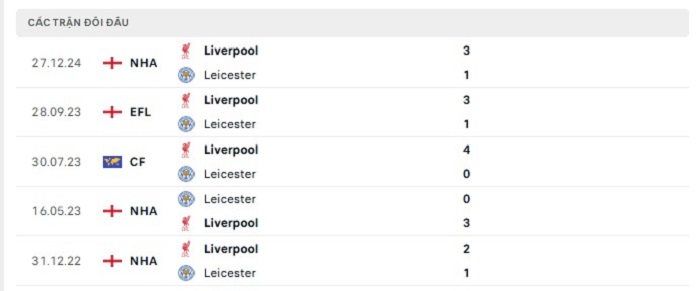 Lịch sử đối đầu của Leicester City vs Liverpool